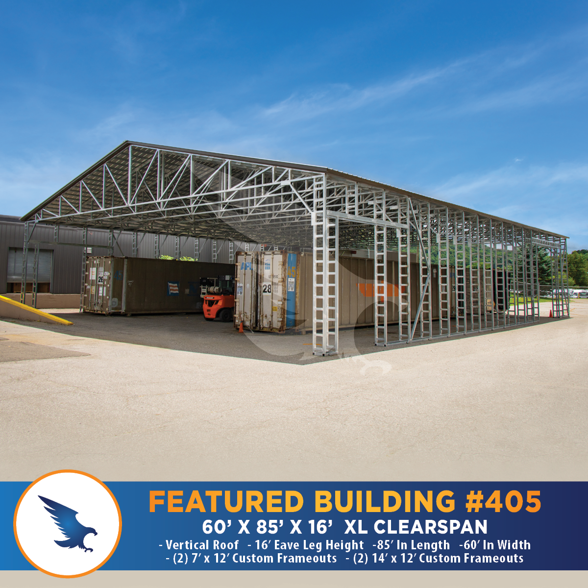 This large-scale XL Clearspan building is ideal for warehouses, distribution centers, or expansive commercial needs. It features a Galvalume vertical roof and trim with multiple custom-sized frameouts and is engineer certified for 140 MPH winds and 35 PSF snow load.