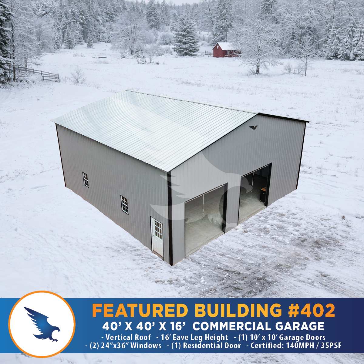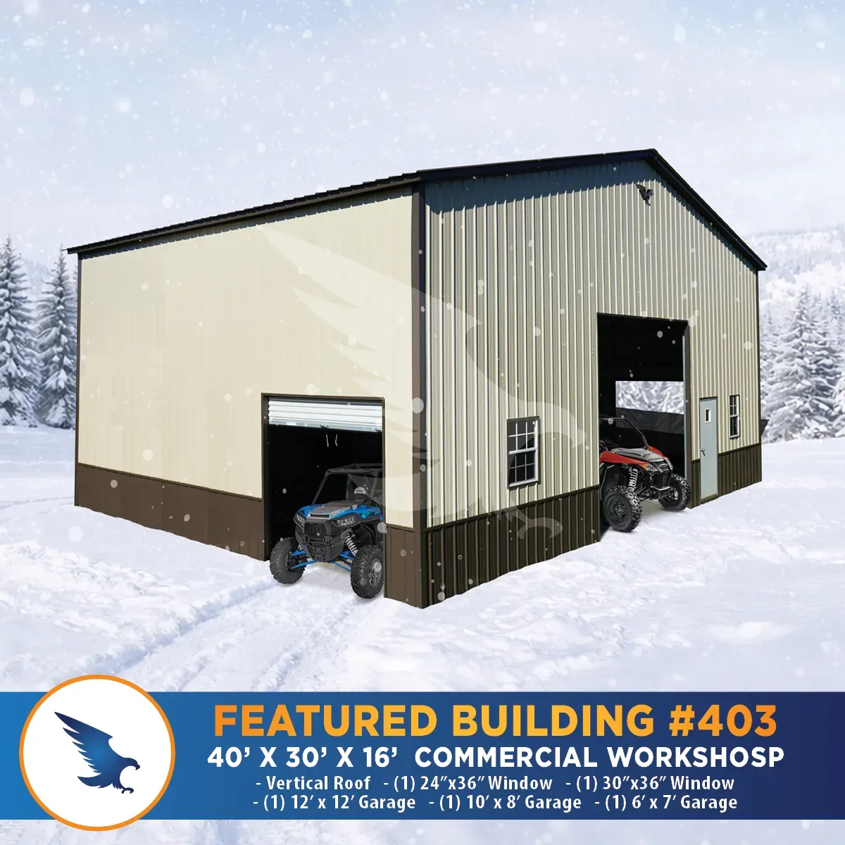 All of our commercial buildings are made in the USA with heavy-duty 14-gauge frames and 29-gauge panels, offering superior strength, longevity, and resistance to high winds and snow loads.