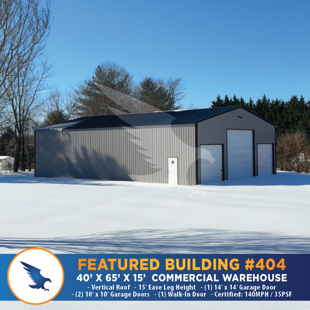 This spacious commercial warehouse offers clear-span design with vertical roof and sides, multiple garage doors, and walk-in access. Engineered for 140 MPH winds and 35 PSF snow load.
