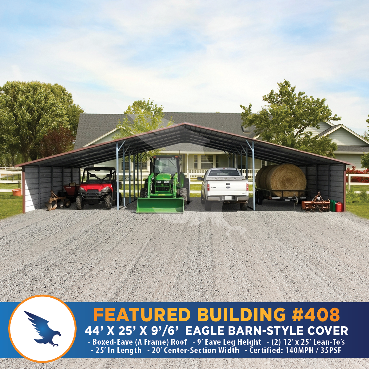 This attractive Eagle Barn-Style Cover features a boxed eave (A-frame) roof with Earth Brown trim, two 12’x25' lean-tos, and a 9' center section. It is designed with practical lean-to coverage and is engineer certified for 140 MPH winds and 35 PSF snow load. Perfect for vehicle protection, equipment storage, or outdoor workspace.