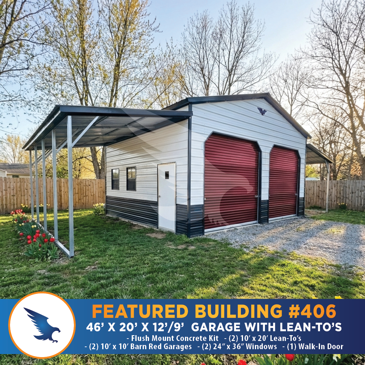46' x 20' x 12'/9' Metal Garage with Lean-To’s